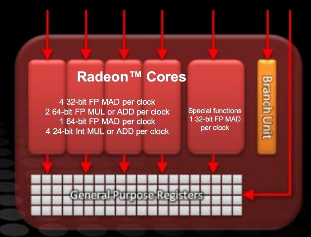 In particolare in figura possiamo notare la struttura dell’unità VLIW 5 delle architetture grafiche AMD. L’unità delle funzioni speciali può eseguire una moltiplicazione e addizione (MAD) in virgola mobile (FP) per ciclo, oppure un passo di elaborazione di una funzione speciale (come funzioni trascendenti, esponenziali eccetera) per ciclo.