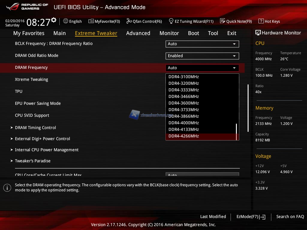 Passiamo ora al Menù ‘’Extreme Tweaker’’ dal quale potremo agire su ogni parametro relativo RAM, CPU, risparmi energetici, funzioni avanzate e così via. Come sempre le voci dei BIOS ROG sono sempre davvero complete ed avremo la possibilità di agire su moltissimi parametri spesso assenti in altri BIOS di altri brand. Ad esempio per la voce RAM Frequency troveremo un valore fino a 4266MHz.