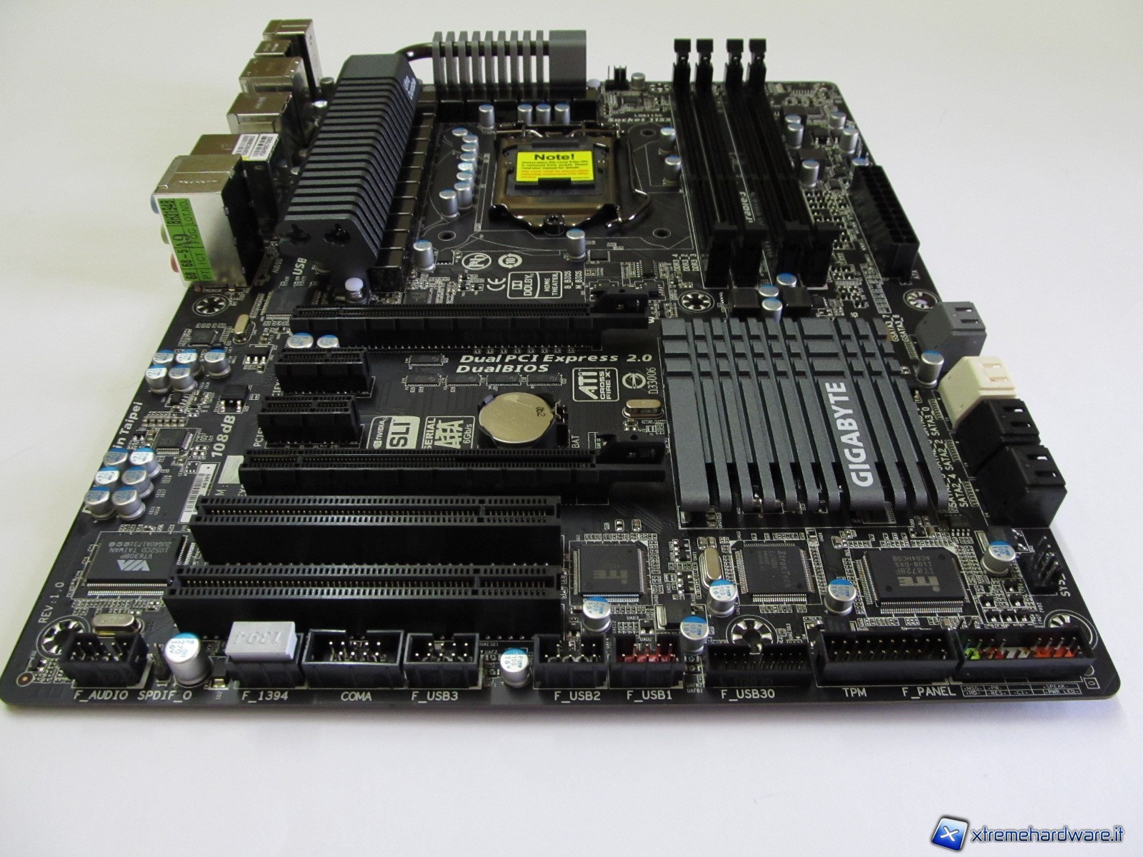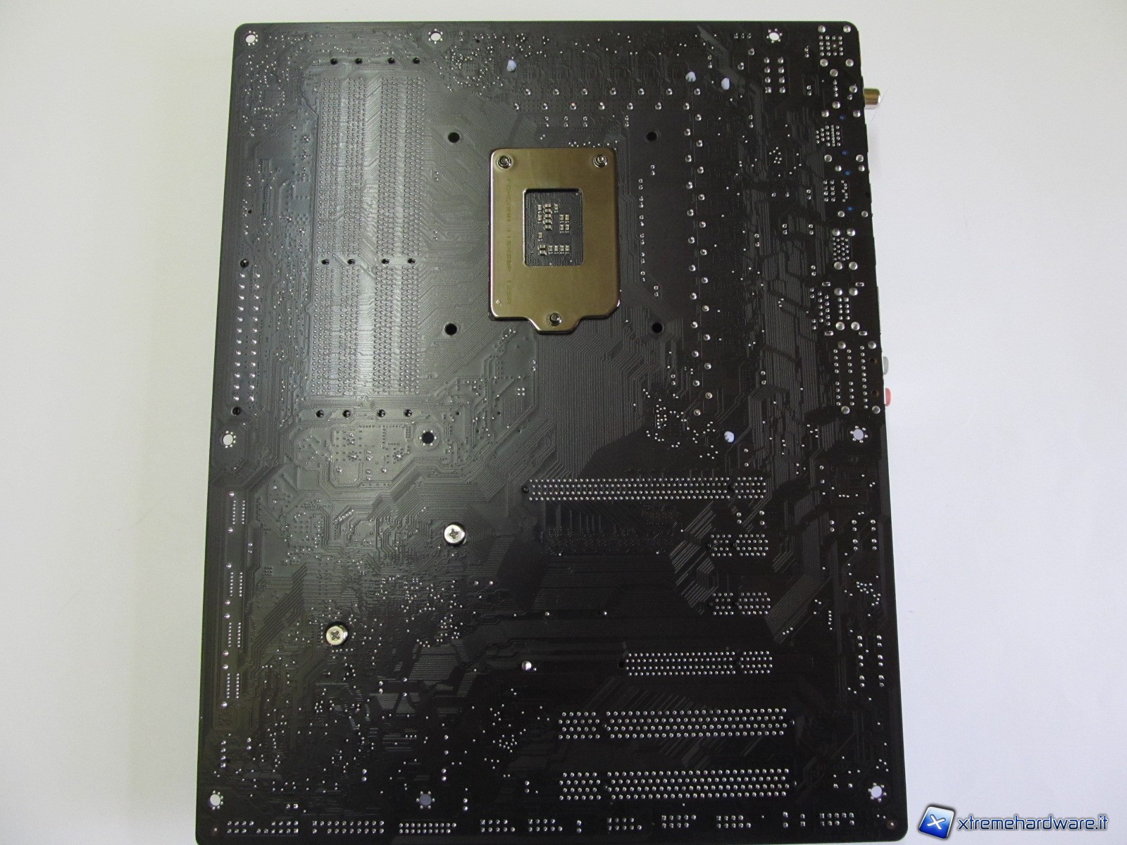 A questo punto osserviamo la piastra nel suo totale. Riteniamo accattivante la scelta di Gigabyte di colorare questa piastra madre di nero. Questa caratteristica è esclusiva delle schede dedicate al segmento enthusiast, mentre le altre schede conservano generalmente un PCB di colore blu. Osserviamo inoltre il lato posteriore del PCB con il dettaglio relativo al backplate del socket LGA-1155 prodotto dalla Foxconn.