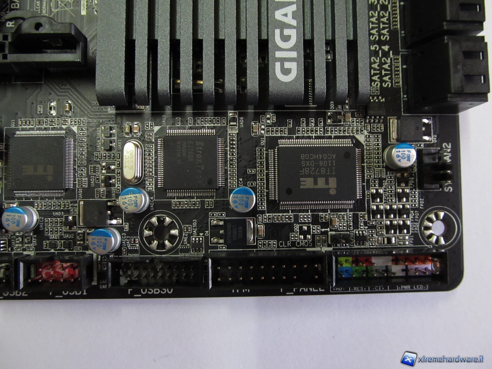 Spostandoci sulla destra, possiamo apprezzare il dissipatore del chipset (Intel Z68), il jumper CMOS, le porte SATA e le connessioni relative al case; nella seconda fotografia possiamo evincere che le porte SATA di colore bianco sono destinate alle connessioni SATA 6Gb/s Intel, quelle grigie alle connessioni SATA 6Gb/s Marvell, e infine quelle nere sono concernenti le connessioni SATA 3Gb/s Intel. In basso notiamo inoltre il Controller USB 3.0 Etron utilizzato da questa Gigabyte in luogo del NEC, in mezzo ai due chip ITE dedicate alle funzioni di hardware monitoring.