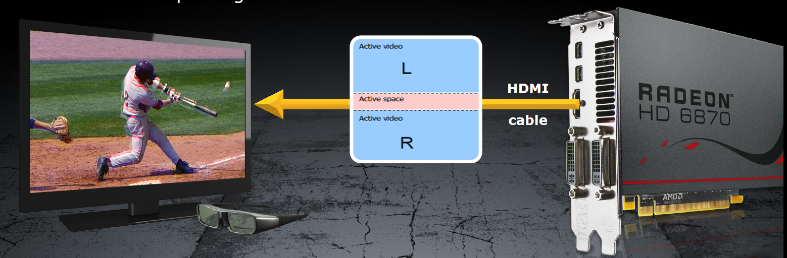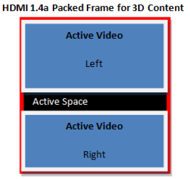 L’HDMI 1.4a prevede invece l’impacchettamento dei frame destro e sinistro in un unico frame alto circa il doppio. Il frame sinistro è posto sopra al destro, separato da una zona chiamata active space. I monitor e le TV compatibili con HDMI 1.4a sono in grado di riconoscere questo pacchetto e di separare i due frame in modo di segnalare in modo corretto agli occhiali 3D quando la frequenza di shuttering per visualizzare alternativamente il frame destro e quello sinistro.