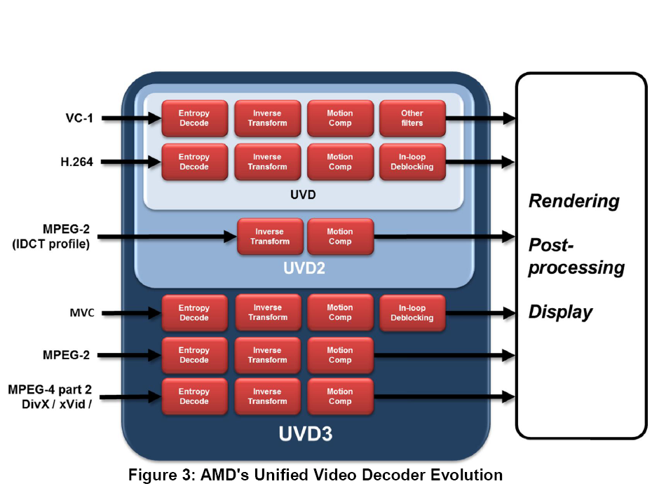 Già nelle VGA delle serie HD 2600 e HD 2400, AMD aveva introdotto il Unified Video Decoder (UVD) per abilitare il decoding di video in HD nel maggior numero possibile di configurazioni per PC. L’UVD è un blocco di hardware dedicato alla sola riproduzione di video nei formati VC-1 e H.264/AVC in maniera tale da poter ottenere la migliore accuratezza e le più alte performance possibili. Questa soluzione permette di convogliare il carico computazionale del playback dei contenuti in HD verso la GPU, liberando così la CPU da tale onere e lasciandola libera di processare altri dati. In più tale gestione della riproduzione video consente anche di ottenere consumi più contenuti a livello di sistema, cosa piuttosto congeniale alle configurazioni che devono garantire una lunga autonomia in condizioni di utilizzo che prevedono una batteria come unica fonte di potenza. Questi vantaggi non sono, però, apprezzabili solo nei prodotti mobile ma consentono nei sistemi desktop di ottenere un minore surriscaldamento della CPU e un conseguente minor rumore generato dal sistema di raffreddamento: caratteristica sicuramente allettante per chi cerca un HTPC.