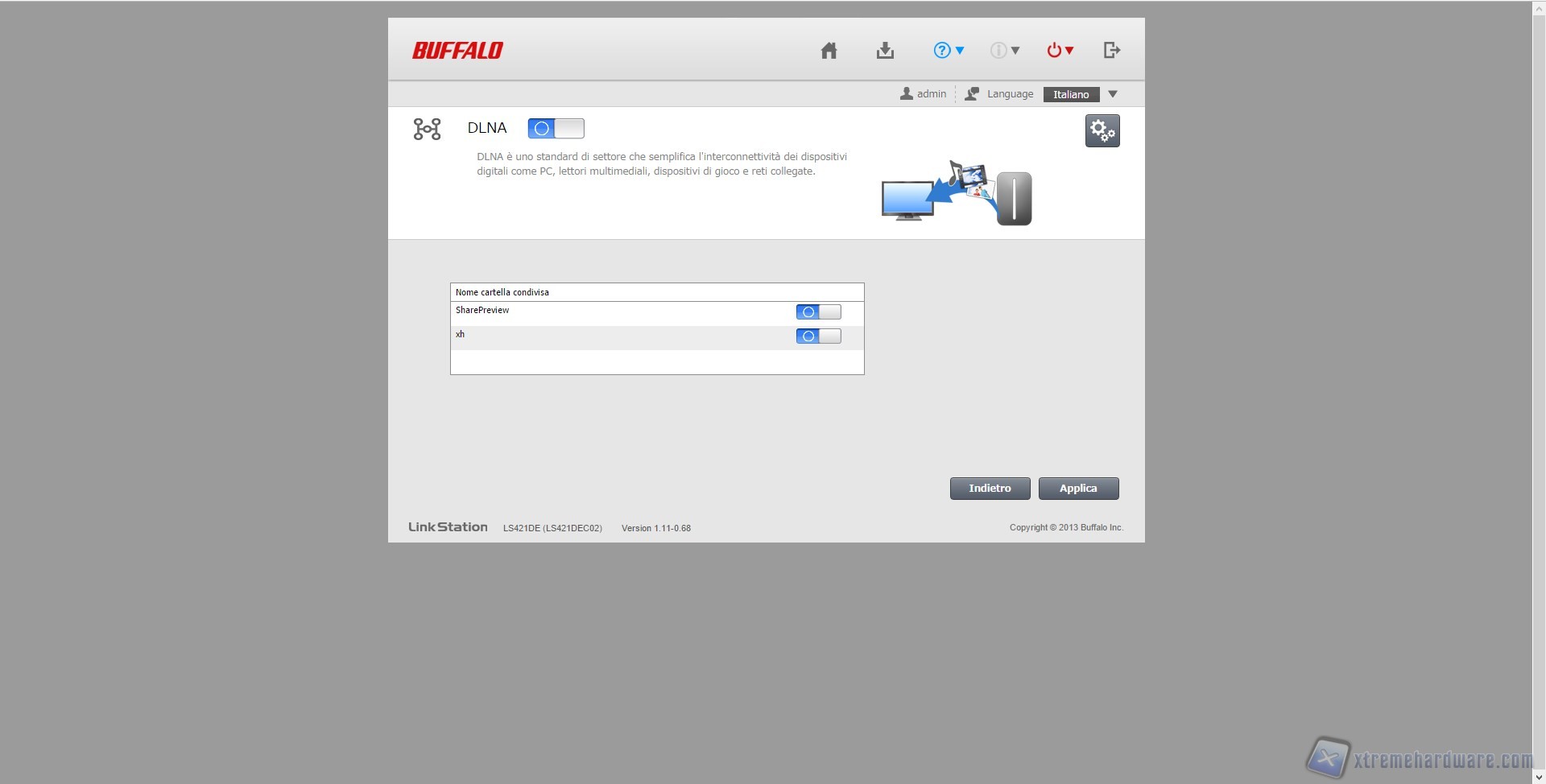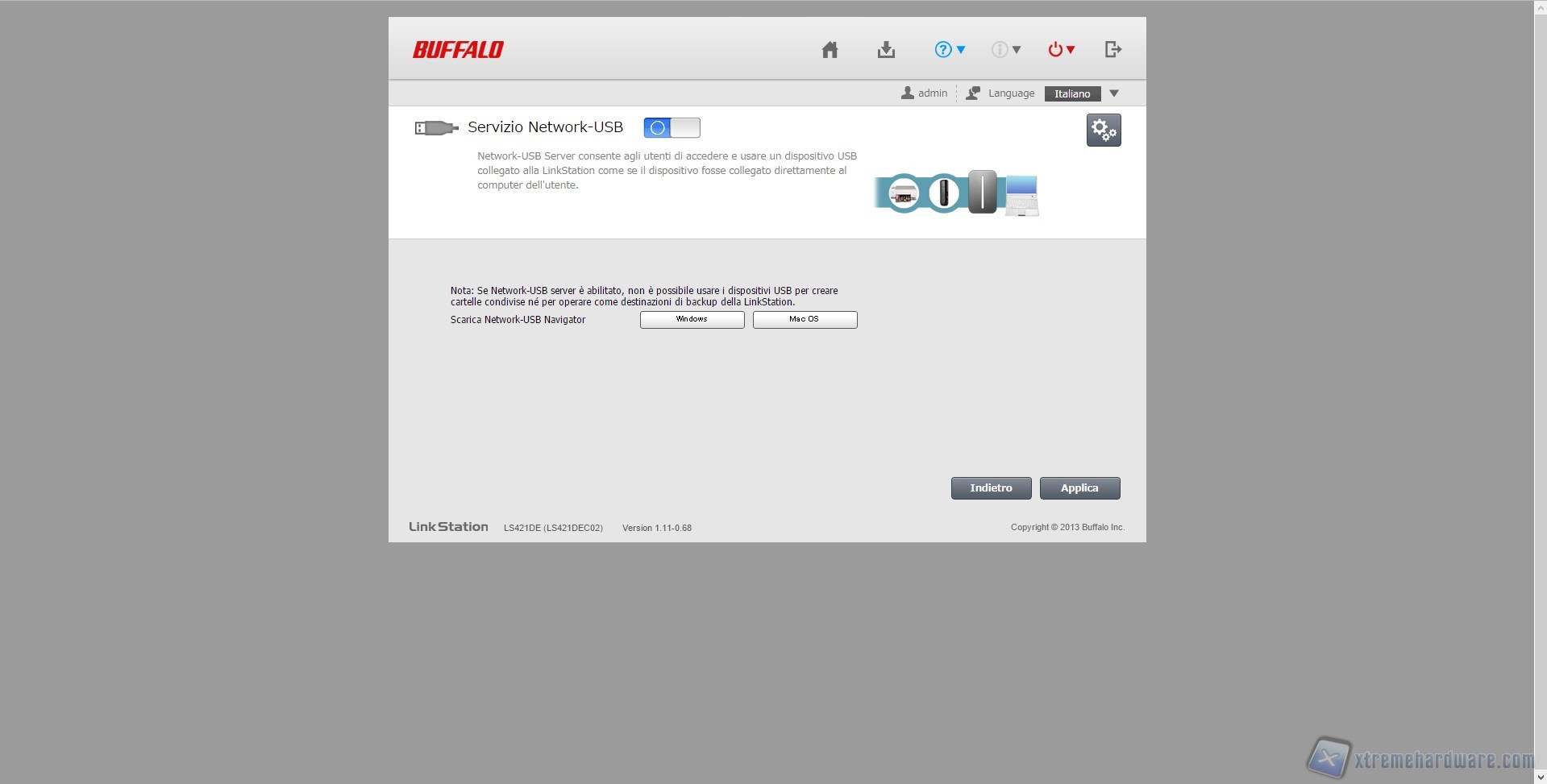 Nella parte alta troviamo il tasto Home, quello che ci rimanda alla pagina di download sul sito Buffalo, il supporto, il tasto di riavvio e quello di logout.