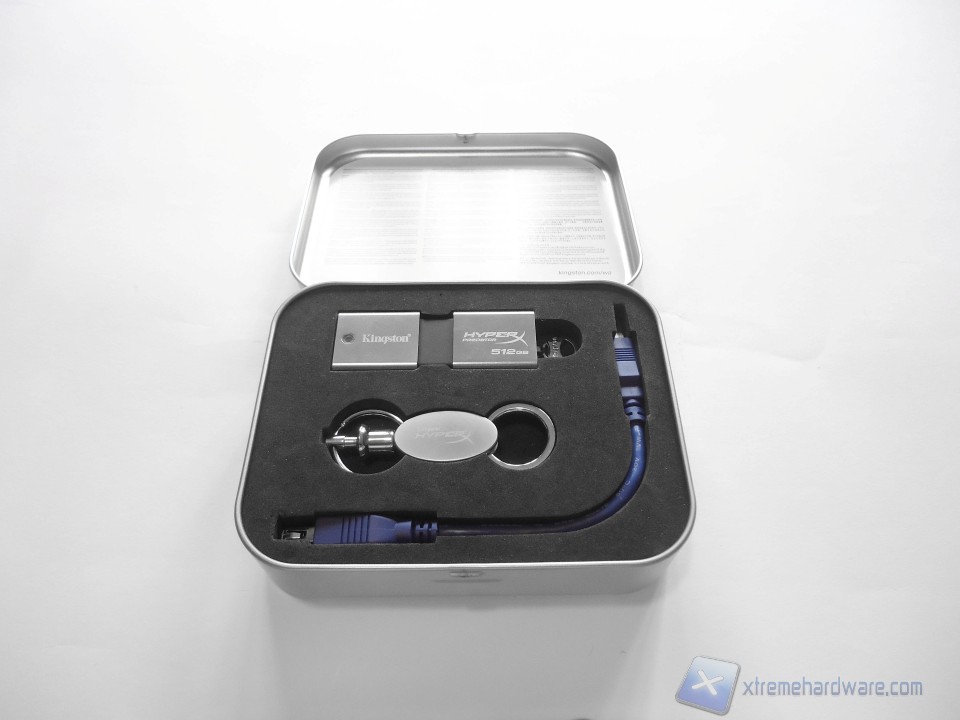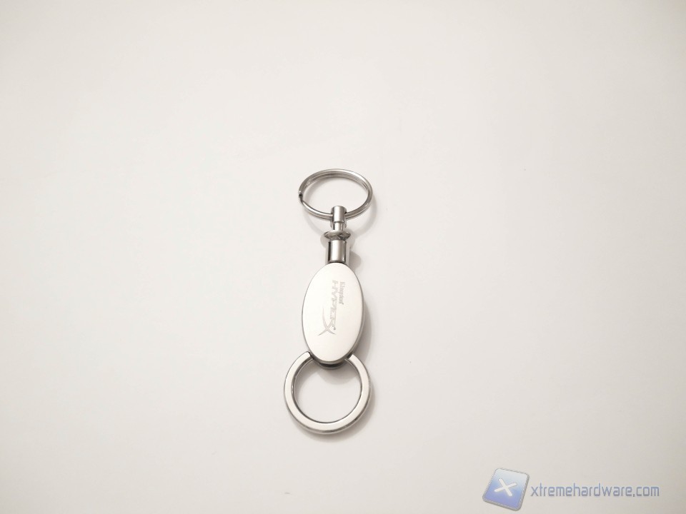 Il bundle comprende un portachiavi marchiato Kingston HyperX e un cavetto USB3.0 per aiutarci a collegare questa enorme pennetta in caso avessimo poco spazio sui connettori posteriori della scheda madre o del nostro notebook.