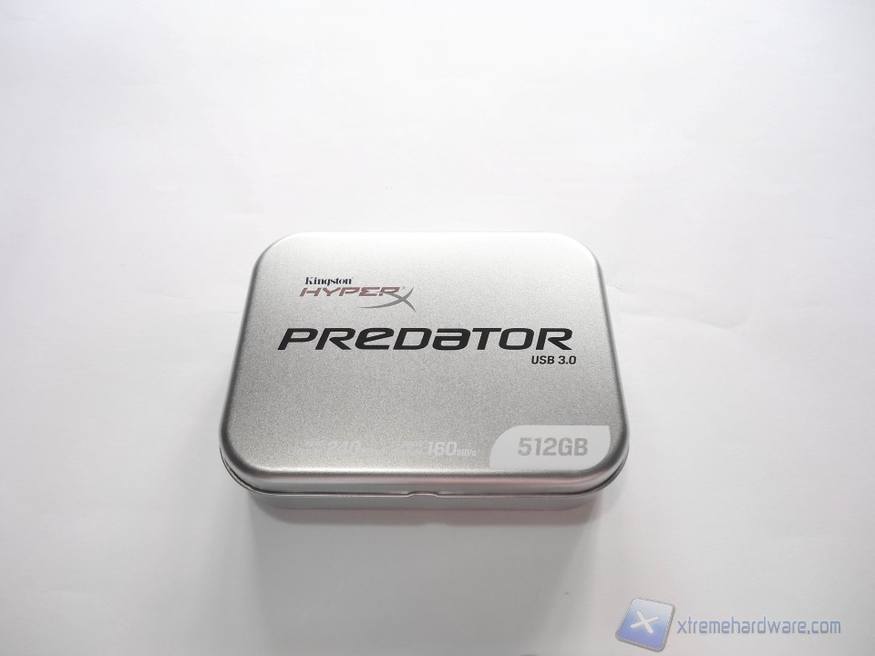 La confezione della HyperX Predator non è il solito blister in plastica  comune alla maggior parte delle penne USB, ma è una confezione argentea in metallo. Dato il costo elevato di questa penna, Kingston non ha badato a spese e non ha trascurato alcun dettaglio. La confezione metallica è di forma rettangolare e le sue dimensioni sono 130 X 100 X 35 mm. Analizzando questa confezione, frontalmente troviamo il nome del prodotto e più in basso rispetto a quest’ultimo sono riportate le specifiche di lettura, scrittura e archiviazione. Nello specifico per la velocità in lettura abbiamo 240MB/s, per la scrittura 160MB/s mentre per la capacità di archiviazione la nostra pennetta offre ben 512GB.